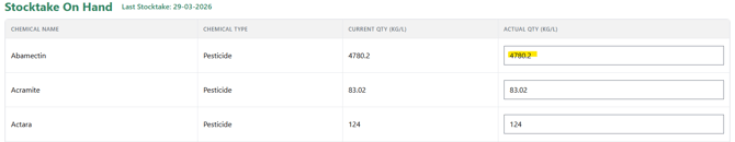 - Navigate to the menu, and select 'Inventory Management' > 'Stocktake'. Here you will be able to view the stock levels of all chemicals within the selected shed.