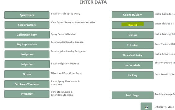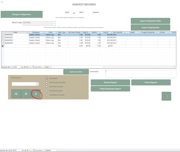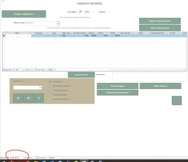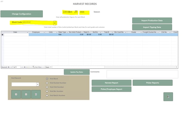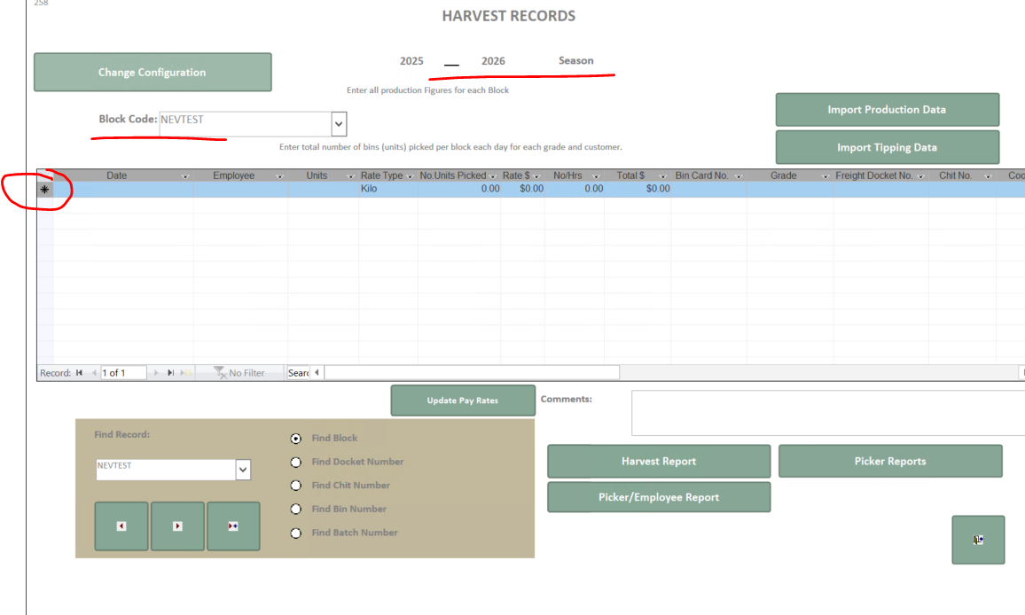 Within the GrowData program, before creating records for a new season you will need to create a new Harvest Record page for each block. This is so that when you scan records, they know which year (or Harvest Record page) to point to.