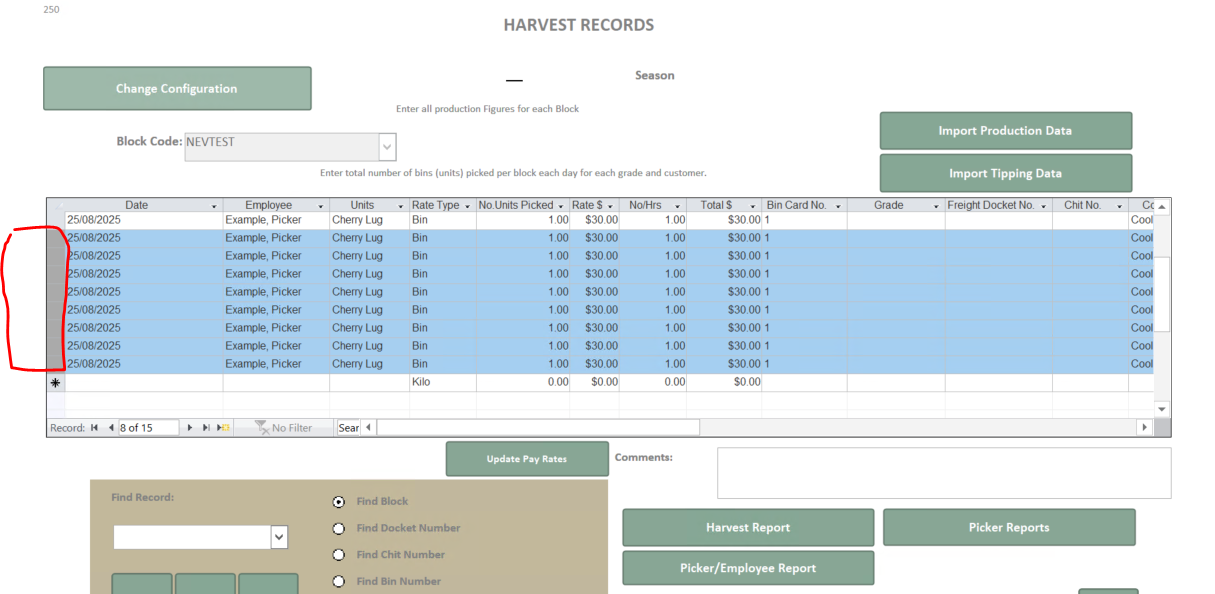 Then, go to the 'right' harvest record page (with the correct block and season at the top) , click on the line with the asterisk and then ctrl+v to paste in the copied records.